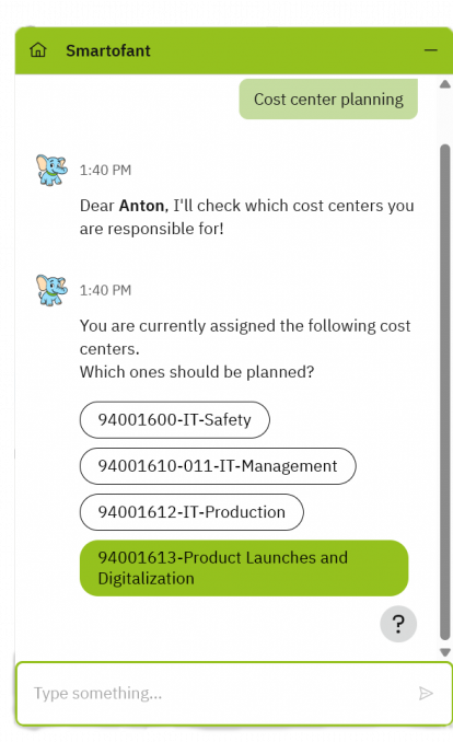 Smartofant hat immer ein offenes Ohr für Sie – und unterstützt auch Planer, die nur gelegentlich ihre Zahlen eingeben, also keine Controlling-Experten sind. Direkt in der Controlling-Software aufrufbar, führt er Sie Schritt für Schritt durch Ihre Aufgaben – etwa bei der Kostenstellen- oder Projektplanung – ganz ohne Expertenwissen.